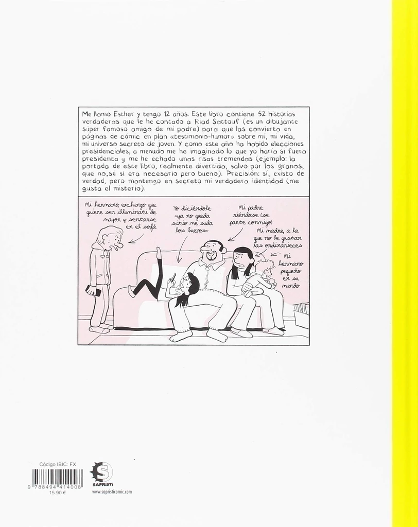 Tercera parte de la nueva serie de novelas gráficas del multipremiado Riad Sattouf, autor de El árabe del futuro. Tercera entrega de la nueva serie de novelas gráficas de Riad Sattouf, autor de El árabe del futuro. Esther ha logrado entrar en una prestigiosa escuela del centro de París. ¡Y es que con doce años ya casi es una adolescente! Las elecciones presidenciales, su primer smartphone, su hámster Manuela, el odioso acné, su insoportable hermano, su adorado padre de izquierdas, su curiosa abuela de derechas. En este volumen aparecen desde el Presidente Macron a los Illuminati sin olvidarnos de su pasión por el pastel de salchicas y albaricoque. ¡Esther está en todo! Esther ha logrado entrar en una prestigiosa escuela del centro de París. ¡Y es que con doce años ya casi es una adolescente! Las elecciones presidenciales, su primer smartphone, su hámster Manuela, el odioso acné, su insoportable hermano, su adorado padre de izquierdas, su curiosa abuela de derechas. En este volumen aparecen desde el Presidente Macron a los Illuminati sin olvidarnos de su pasión por el pastel de salchicas y albaricoque. ¡Esther está en todo!